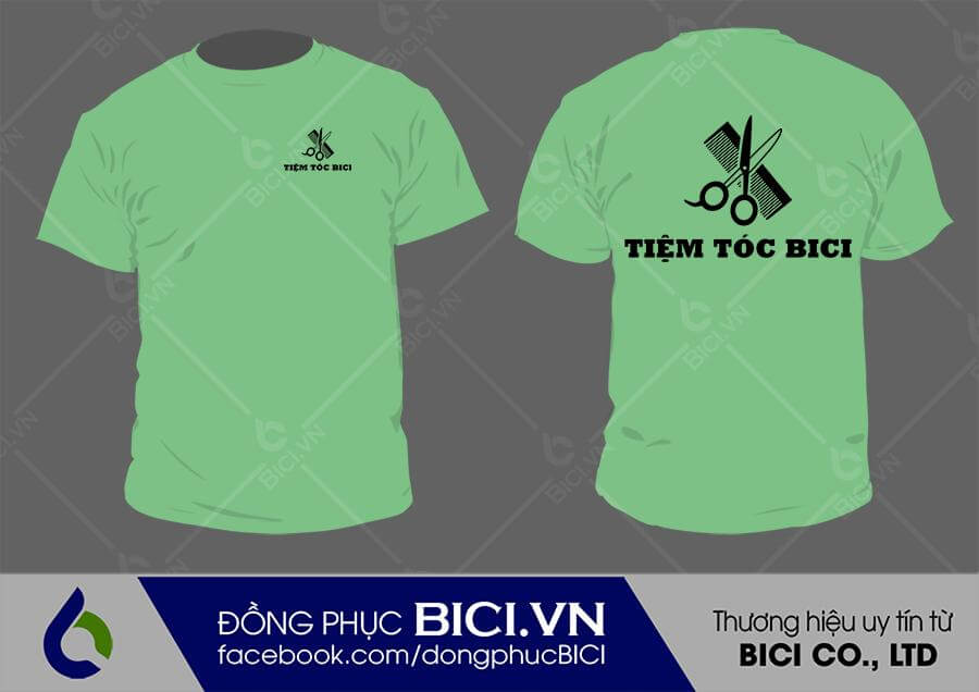 - Hình in: Logo và tên tiệm tóc với tone đen nổi bật trên nền áo, giúp người nhìn có thể biết và dễ dàng ghi nhớ thương hiệu làm đẹp của bạn.